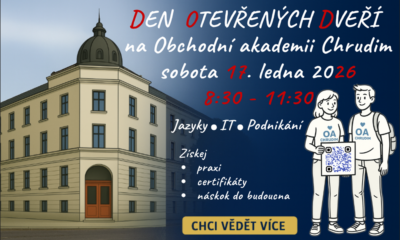 srdečně Vás zveme na Den otevřených dveří Obchodní akademie Chrudim, který se uskuteční v sobotu 17. ledna 2026. Těšíme se na Vás.