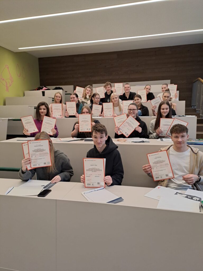 V pátek 23. 1. 2026 převzalo 26 studentek a studentů 4. ročníku mezinárodně platné certifikáty o úspěšném složení zkoušky ESOL International z angličtiny v úrovních B1 a B2. Úspěšnost byla 100%, všichni uchazeči zvládli náročnou písemnou i ústní část. Tímto certifikátem si zároveň mohou nahradit profilovou část maturitní zkoušky z tohoto předmětu.