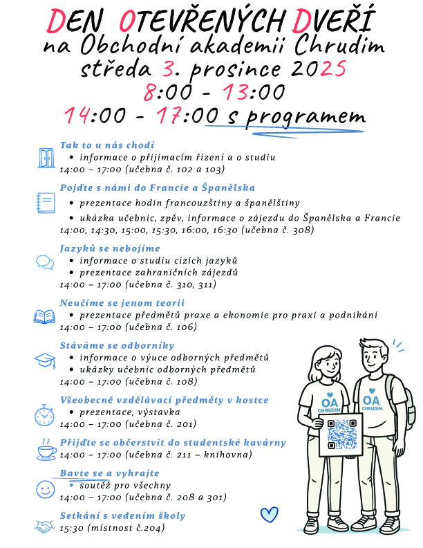 na středu 3. prosince 2025 jsme pro Vás připravili den otevřených dveří na Obchodní akademii Chrudim.