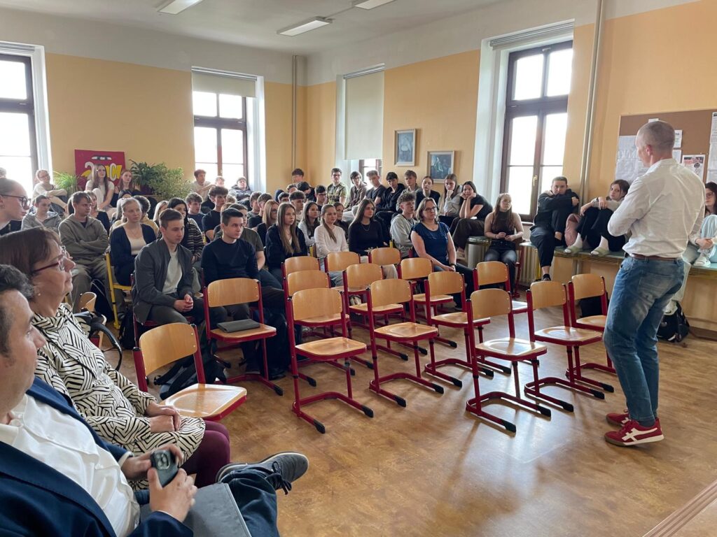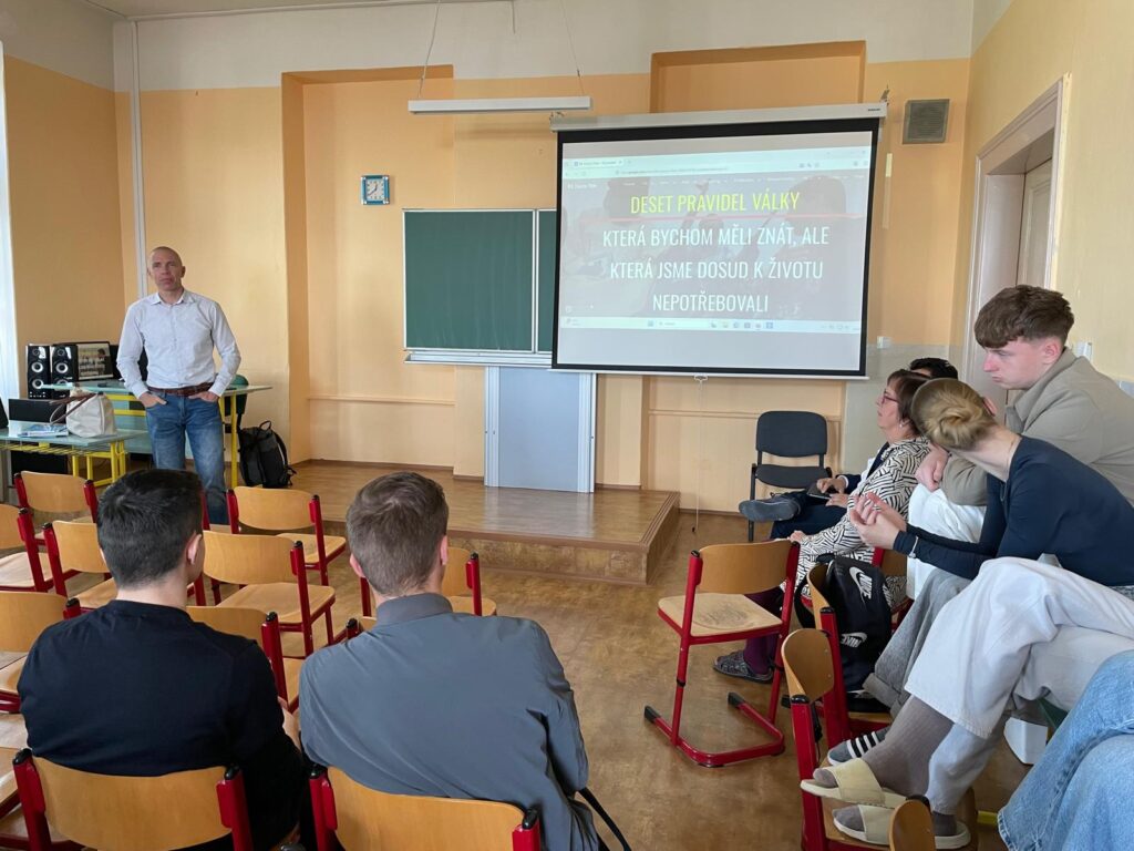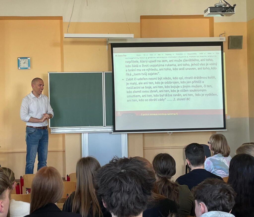“Jak funguje právo, když selže mír?” – to je název workshopu, který ve čtvrtek 23. dubna absolvovali studenti 3. ročníku a který vedl odborník na aplikovanou etiku, mezinárodní humanitární právo a krizové řízení, v minulosti také velitel Ústředního krizového týmu Českého červeného kříže, pan Ing. Richard Smejkal, Ph.D.