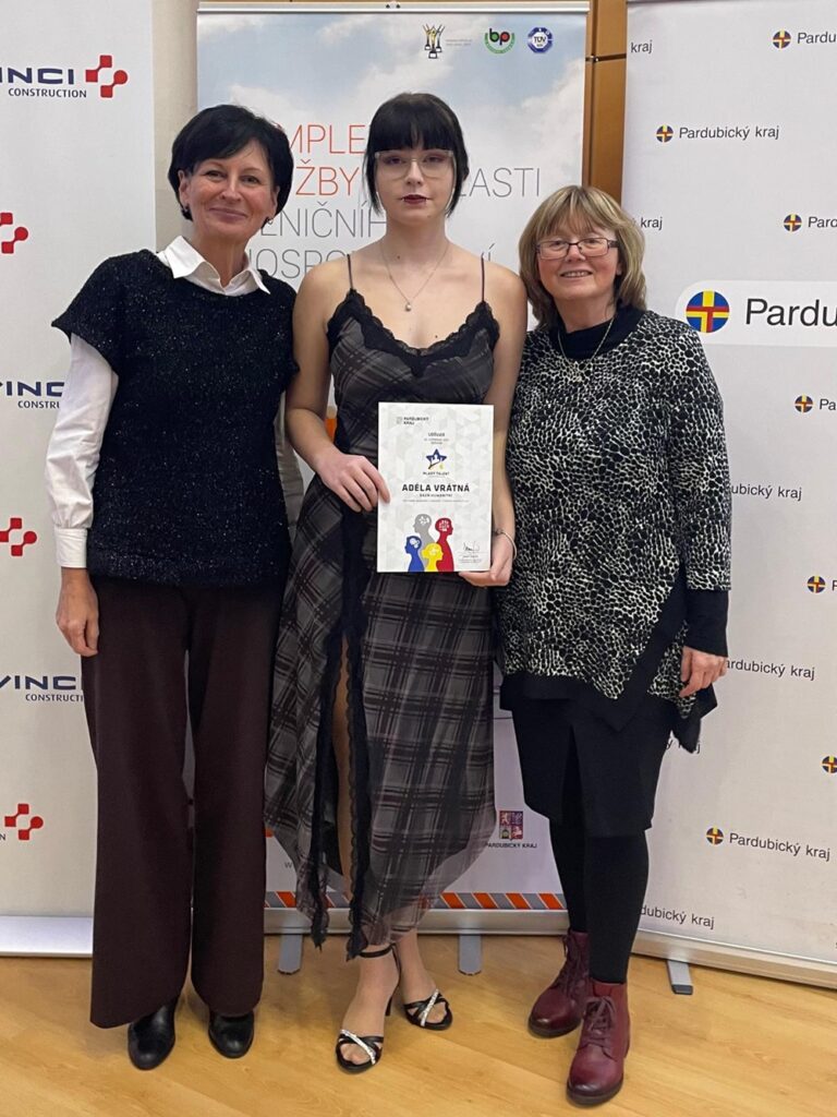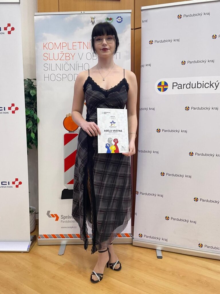 Ve středu 26. 11. 2025 proběhlo v aule Univerzity Pardubice slavnostní předávání ocenění Mladý talent Pardubického kraje 2025. Tato cena se každoročně udílí žákům, kteří jsou inspirací nejen pro své vrstevníky, ale mnohdy i pro dospělé. Ocenění je vyjádřením uznání za cílevědomost, tvořivost, vytrvalost, za smysl pro fair play, respekt k druhým a pomoc člověku v nouzi. Mezi oceněnými žáky, kteří byli na základě nominací z celého Pardubického kraje vybráni, byla i Adéla Vrátná, žákyně čtvrtého ročníku naší školy, a to za vítězství v krajském kole a postup do celostátního kola Středoškolské odborné činnosti v oboru pedagogika, psychologie a sociologie. Její práce Fenomén sebepoškozování a možnosti jeho léčby může sloužit jak jednotlivcům se sklony k sebepoškozování, tak jejich blízkým a pedagogům. Tato práce tak skutečně pomáhá a může přispět k lepšímu porozumění duševnímu zdraví mladých lidí.